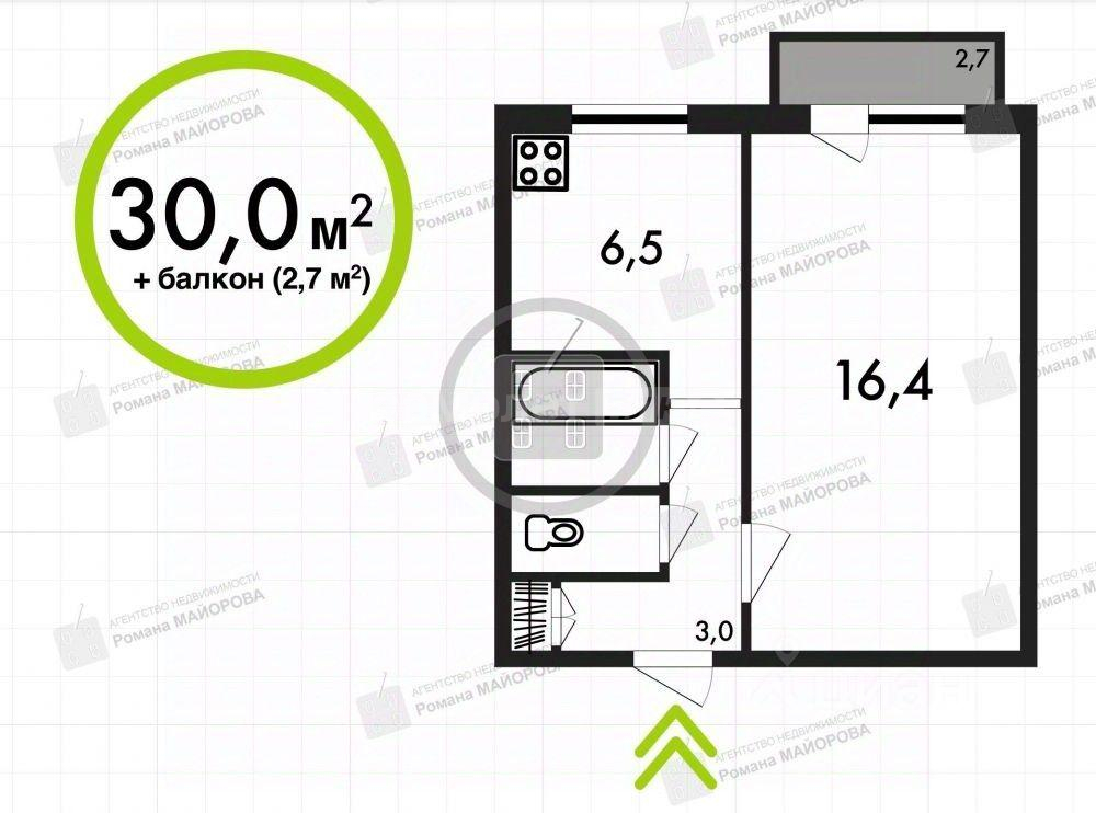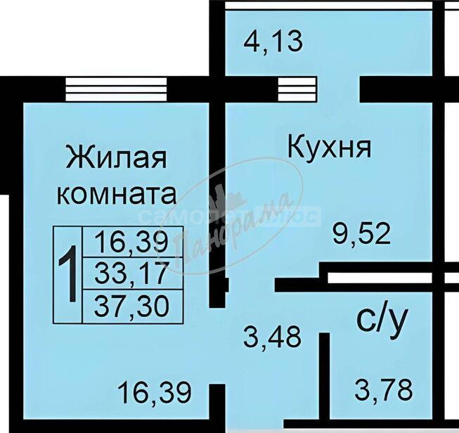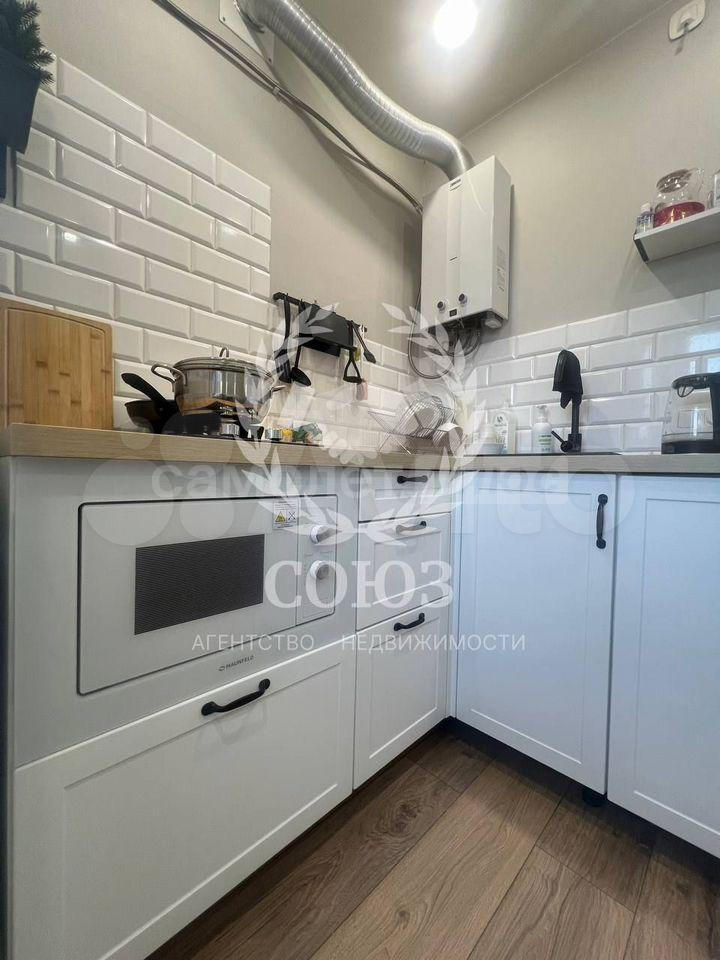 Общая площадь квартиры 33 квадратных метра, из которых на кухню приходится 9 квадратных метров.