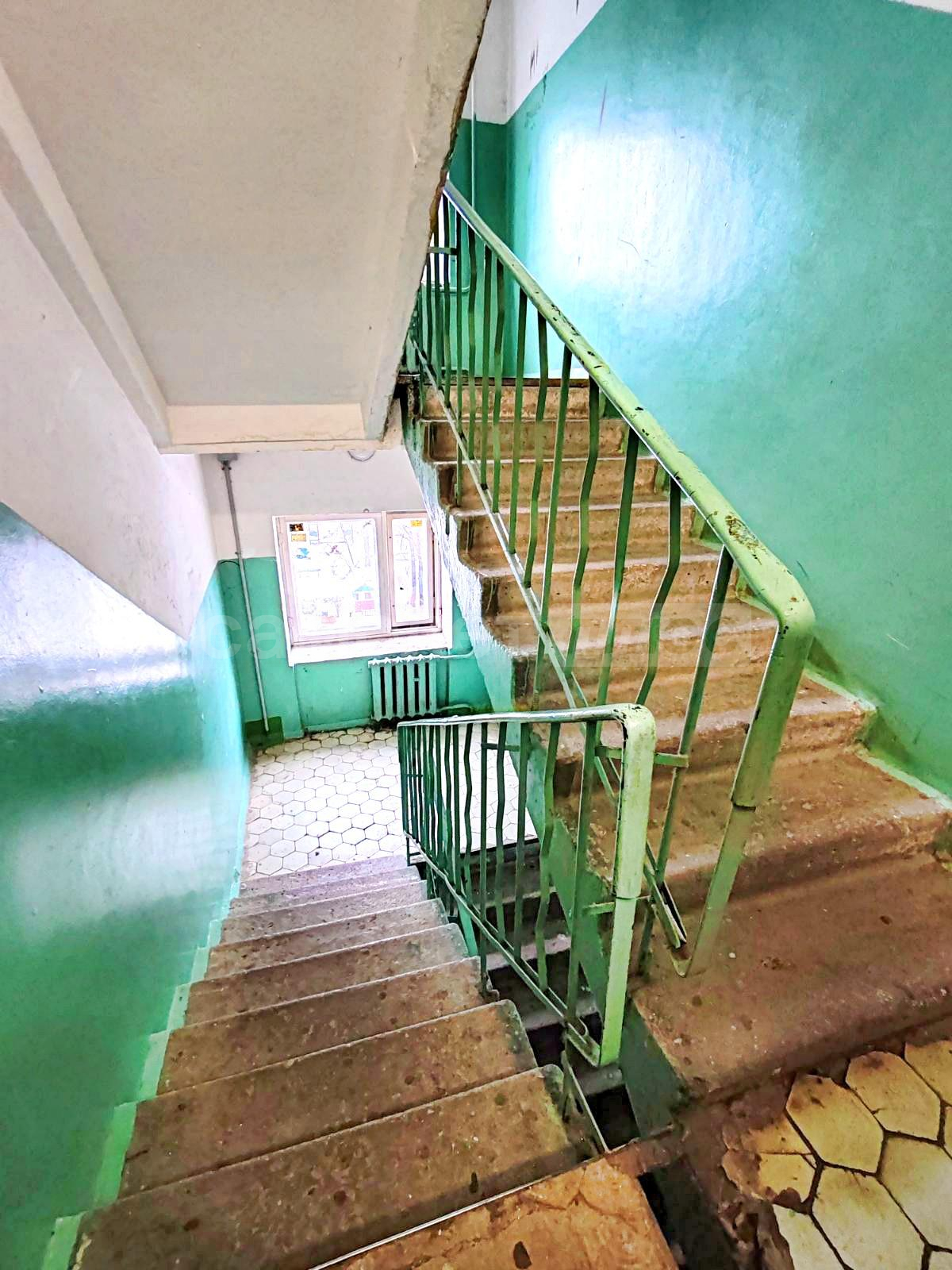Просторный подъезд с высокими потолками и просторными лестничными клетками.
