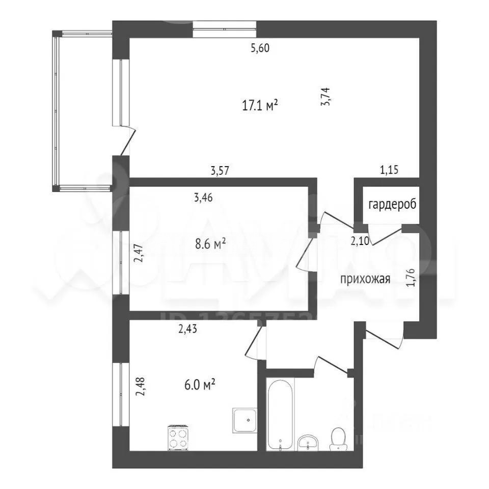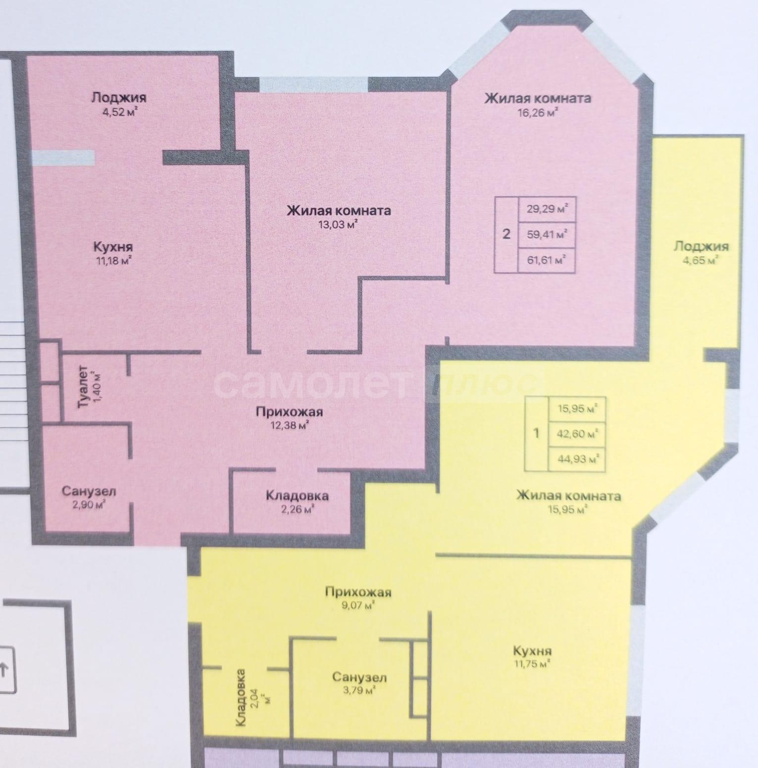 Двухкомнатная квартира 61,61кв.м., уникальная планировка, лоджия с панорамным остеклением