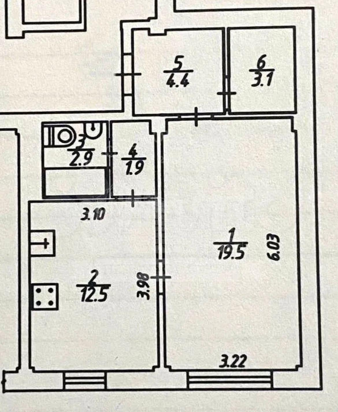Квартира площадью 44,3 кв.м. Просторная комната 19,5 кв.м., кухня 12,5 кв.м.