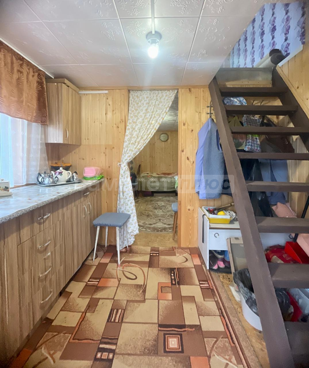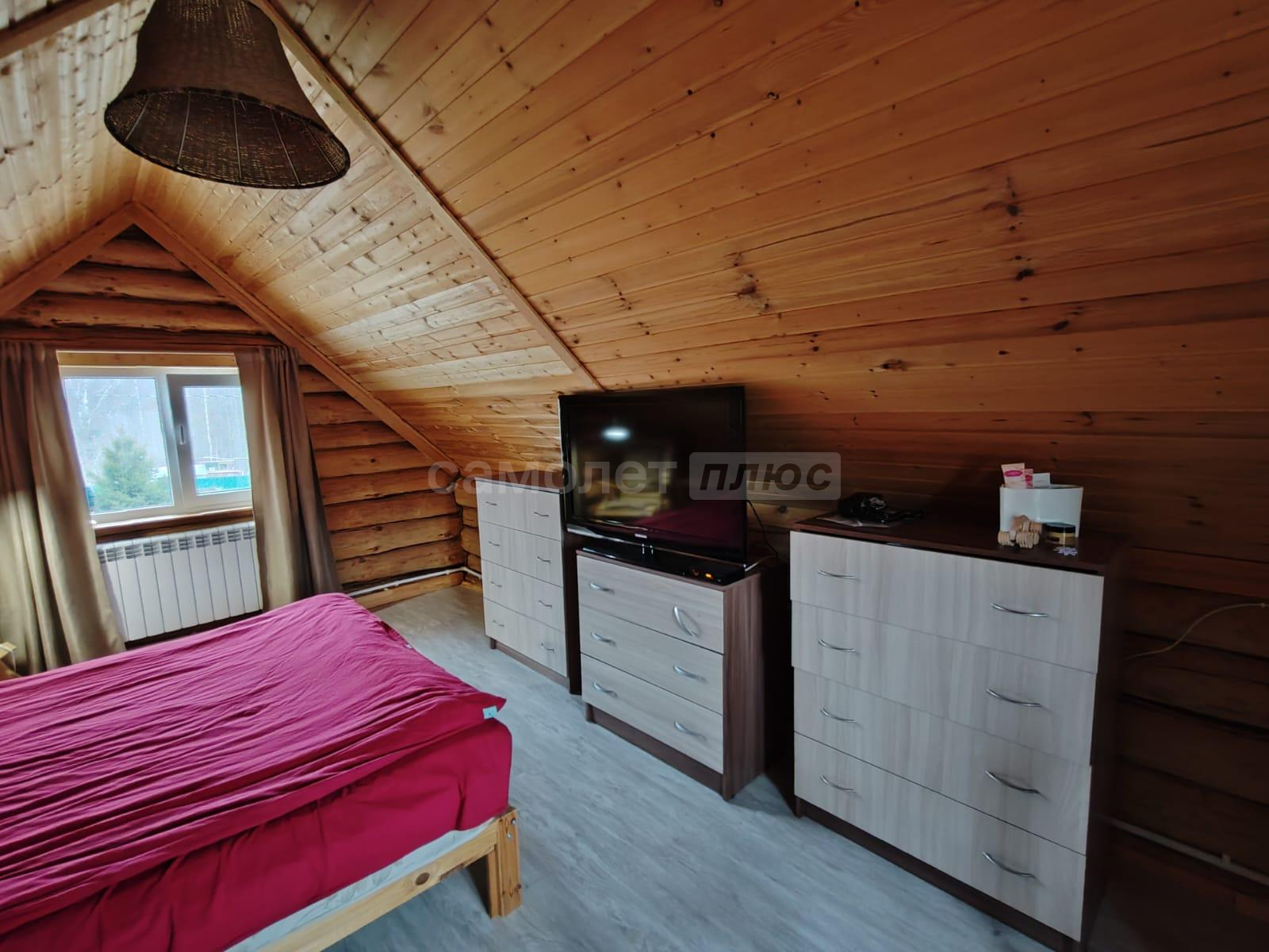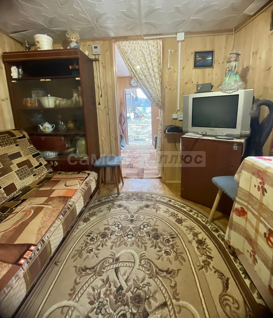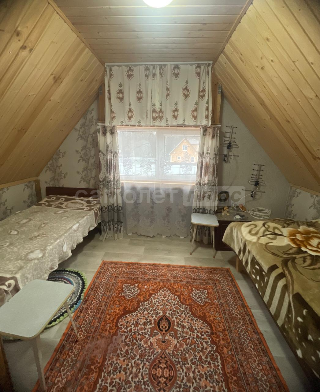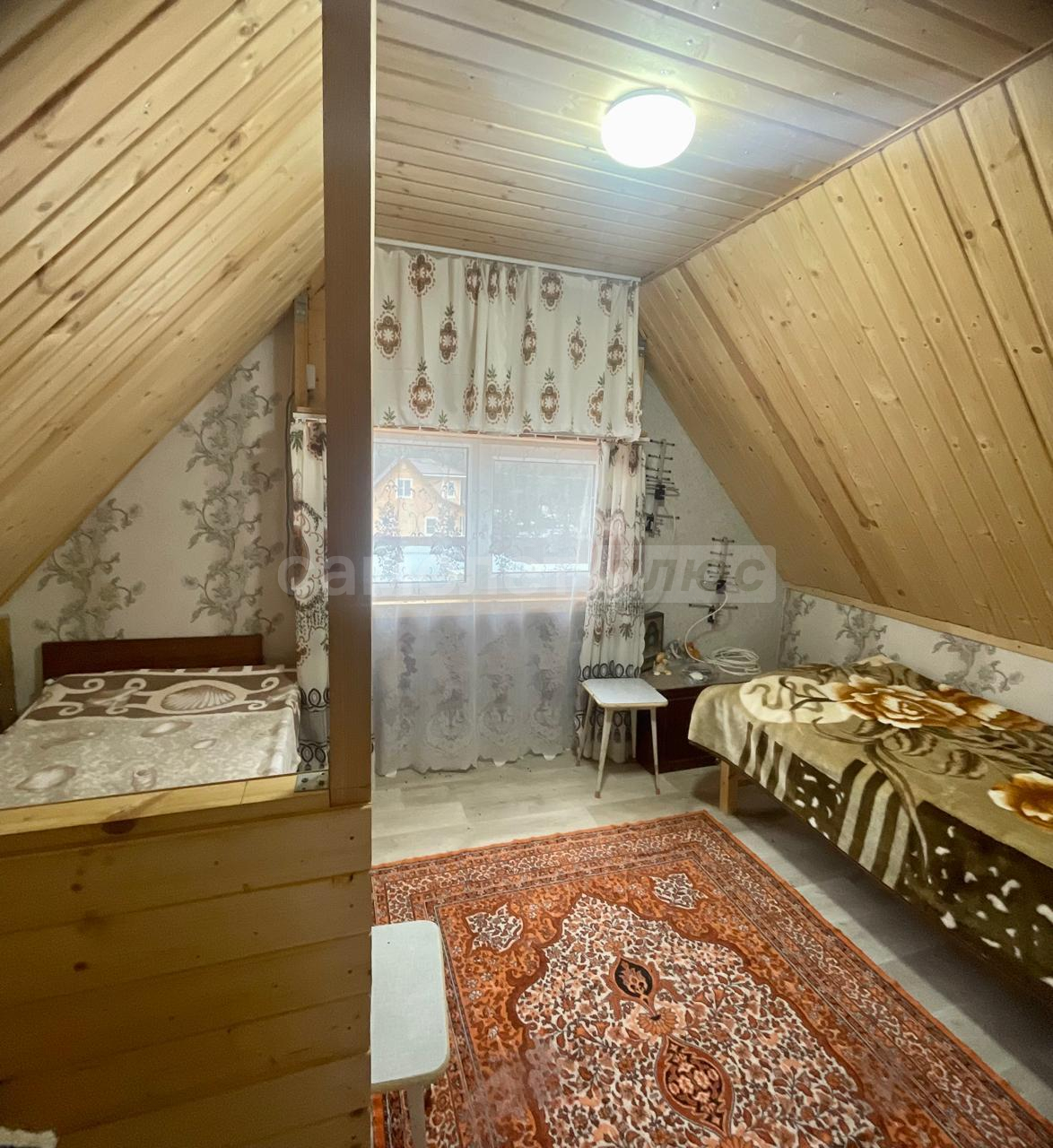 Внутри сделан ремонт на 2х этажах. На первом этаже расположена кухня, комната отдыха, на 2-м этаже спальня с прекрасным видом на ухоженный участок и на природу.