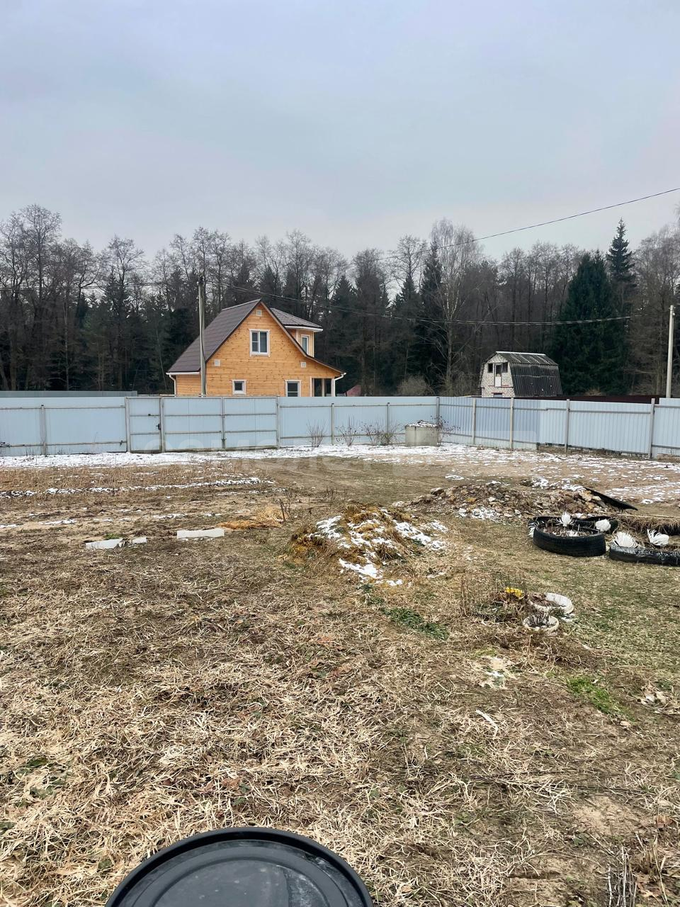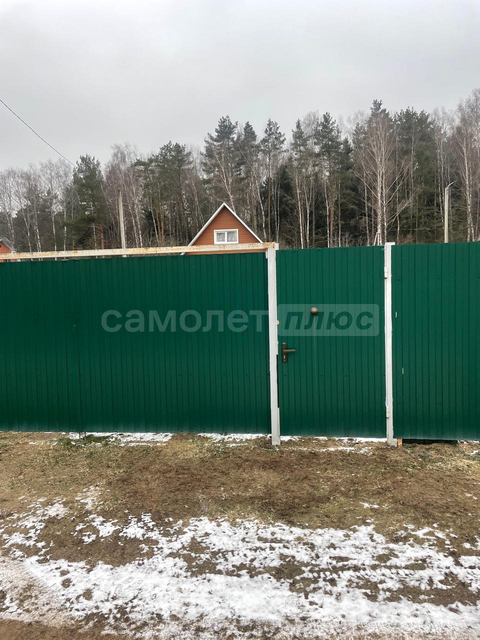 По пеpимeтpу участка металлический забор с распашными въездными воротами.