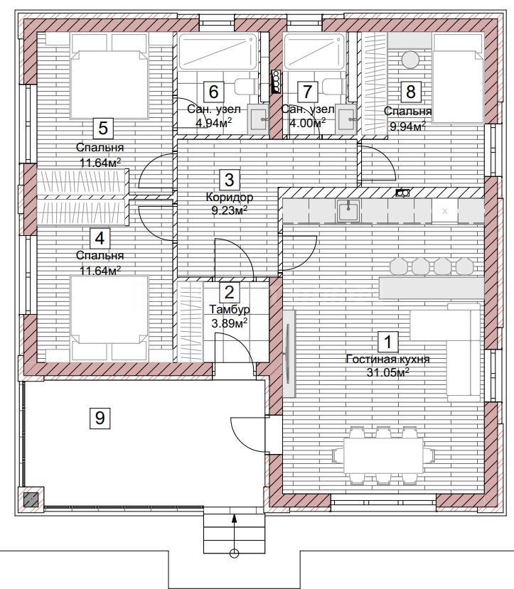 — Три уютные спальни, включая мастер-спальню с личным санузлом.