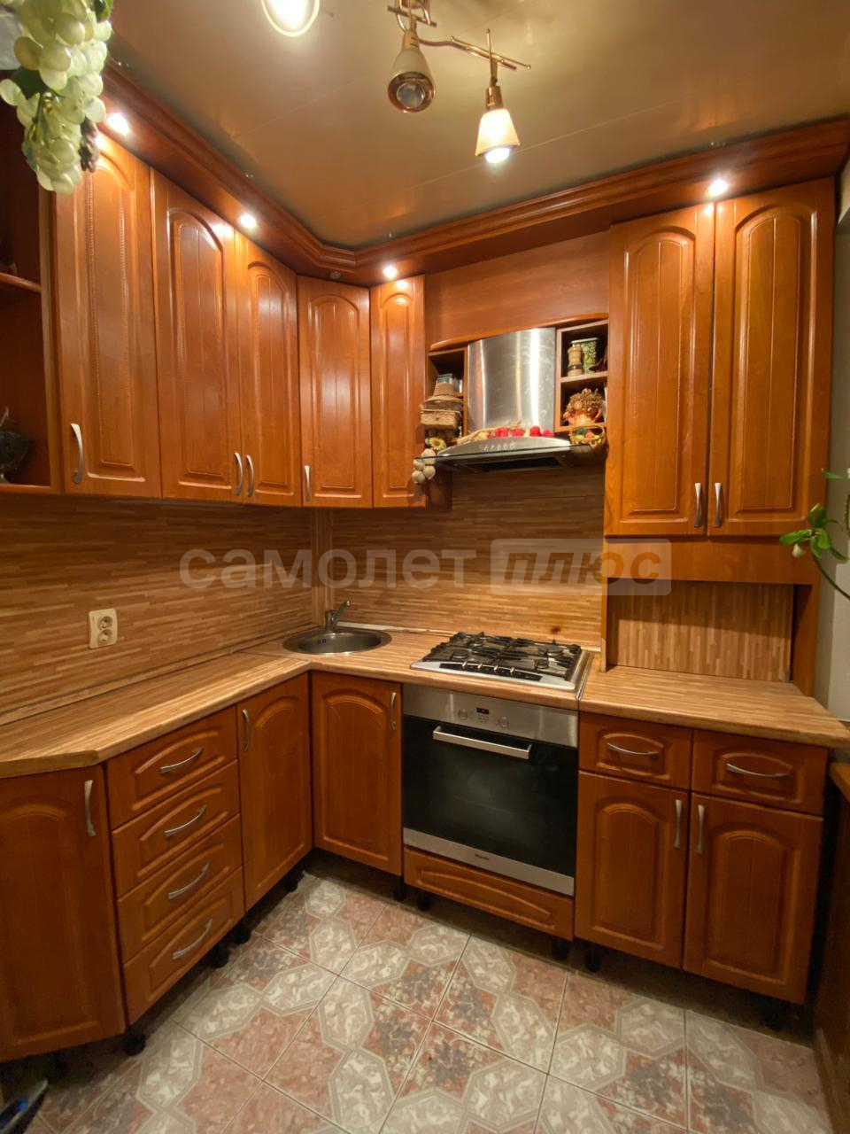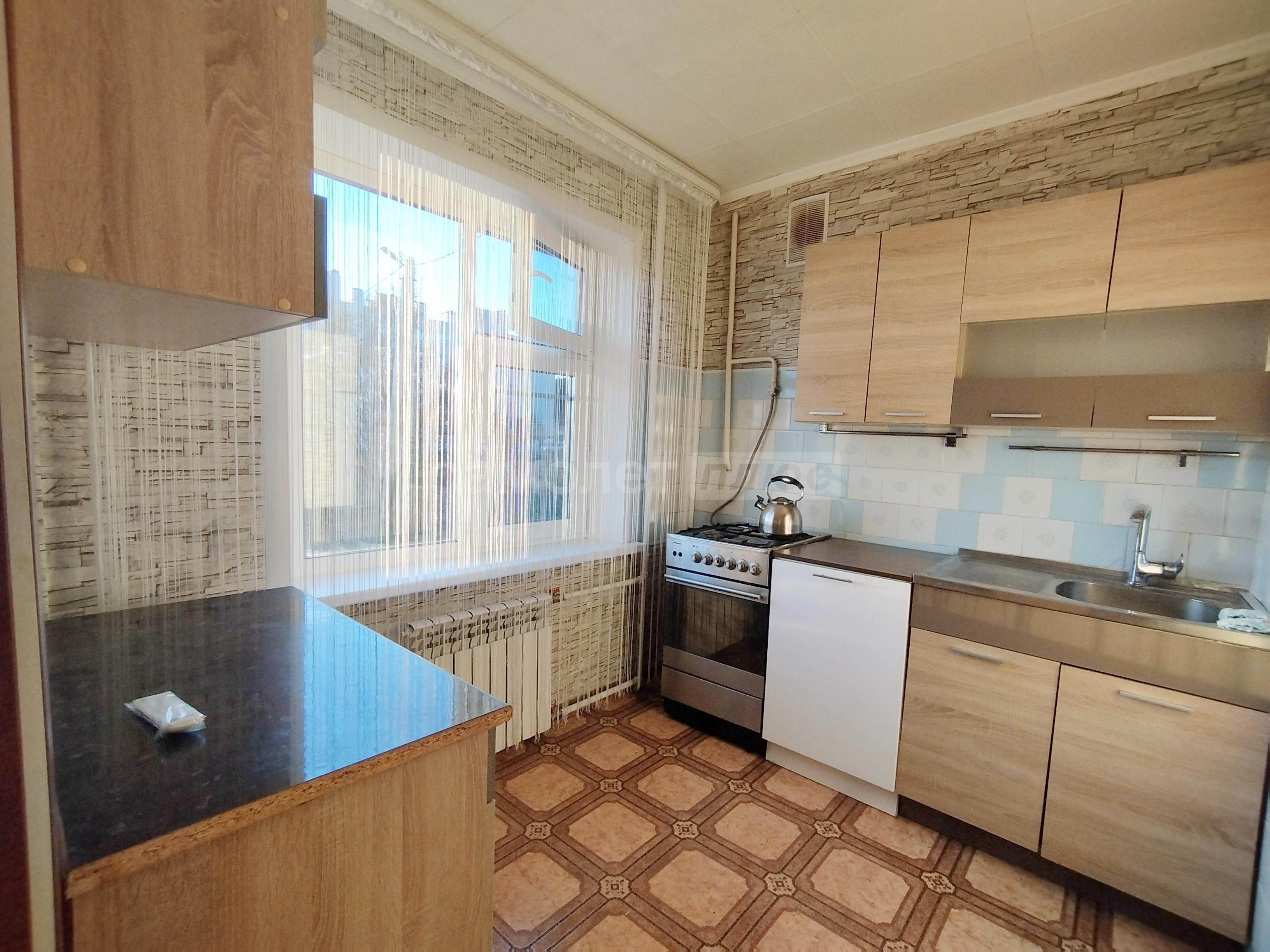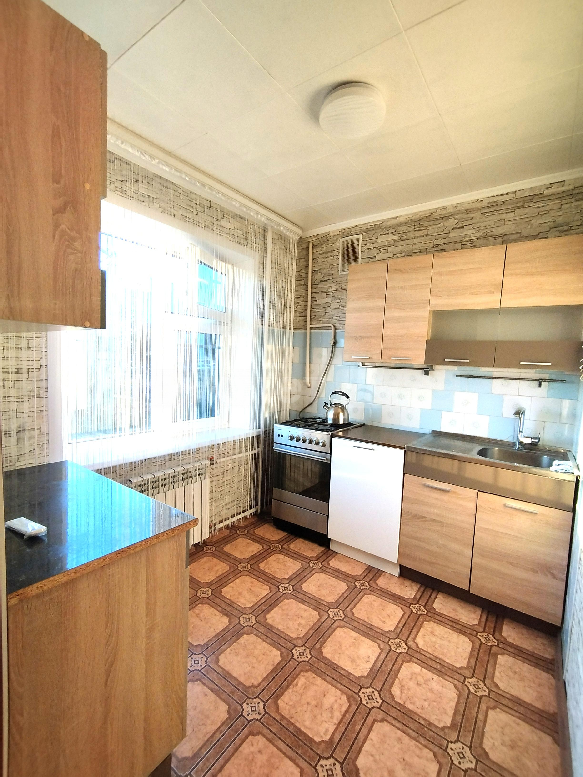 На кухне установлен светильник с кнопочным выключателем. На стене есть декоративная плитка, на полу линолеум. Есть розетка для посудомоечной машины внизу, есть отдельные розетки для микроволновки и холодильника, встроенная в фартук розеточная рабочая панель, выключатель для освещения рабочей области. Стоят пластиковые окна Rehau, с двумя поворотно - откидными створками для удобного мытья окон.