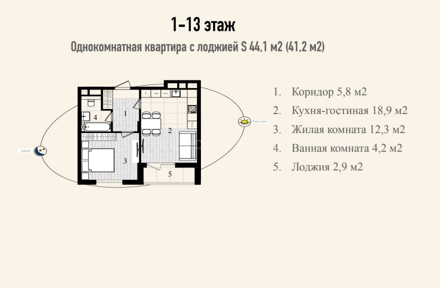 Продается 1-к квартира 44,1 м2 7/14 эт. коридор 5,8 м2 , кухня - гостиная 18,9 м2 , жилая комната 12,3 м2 ,ванная комната 4,2 м2 , лоджия 2,9 м2 .