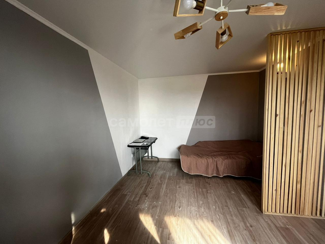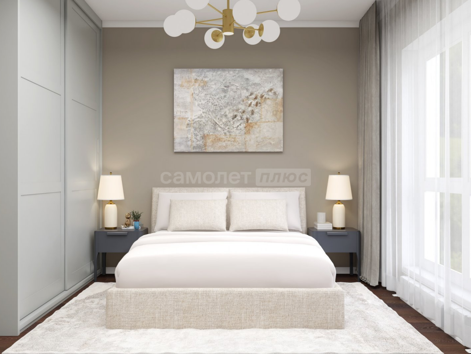 В комнате на полу ламинат. Выполнено дизайнерское зонирование, которое разделяет комнату на гостевую, рабочую и спальную зоны. В каждой зоне есть розетки для техники. В спальной зоне установлена декоративная реечная перегородка, а над кроватью, есть розетки и выключатель для настенного светильника. Установлены пластиковые окна Rehau.
