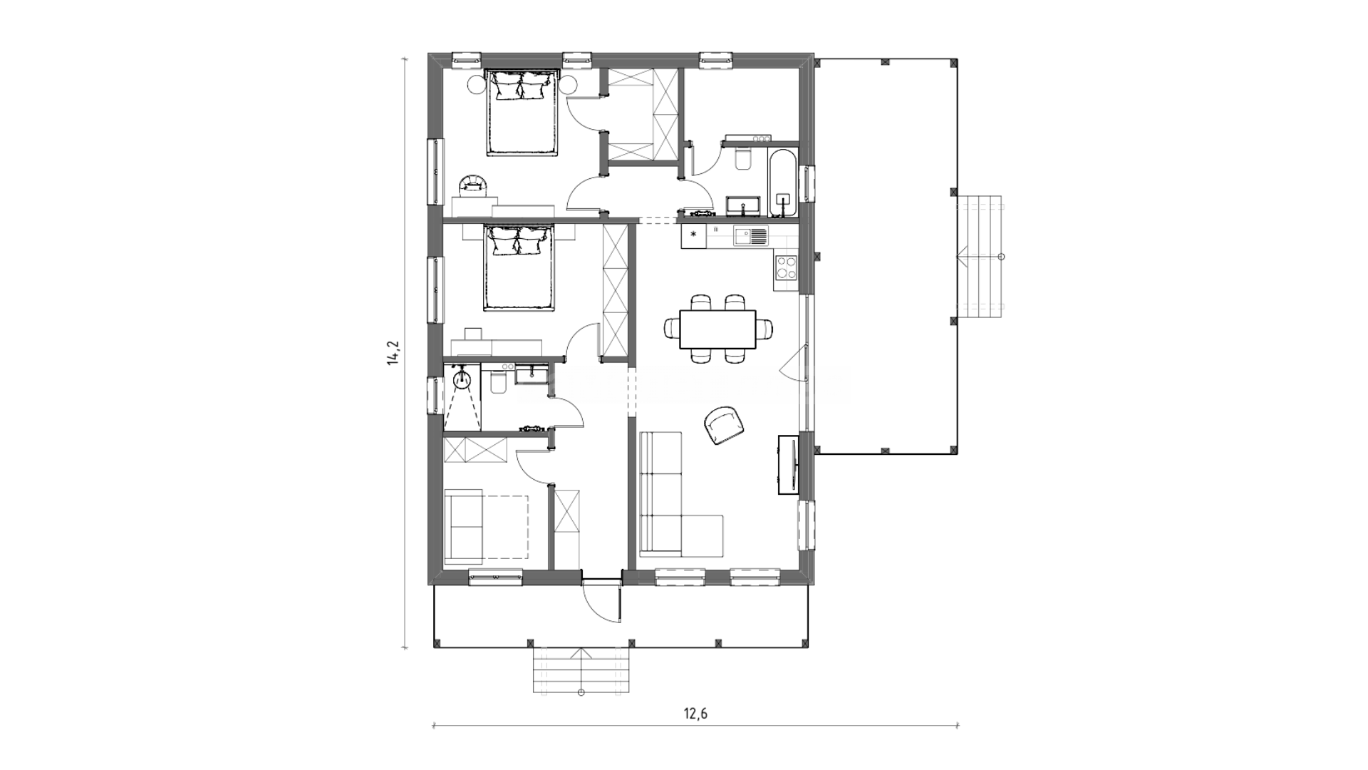 Главная спальня с собственной ванной комнатой и гардеробной в приватной части дома. Спальни отделены коридорами от общественной части дома. Просторная кухня - гостиная предназначена для уютных семейных вечеров и шумных вечеринок с друзьями. А большая крытая терраса приглашает проводить на воздухе как можно больше времени. Играйте с детьми. Принимайте гостей. Приветствуйте солнце с чашкой кофе.