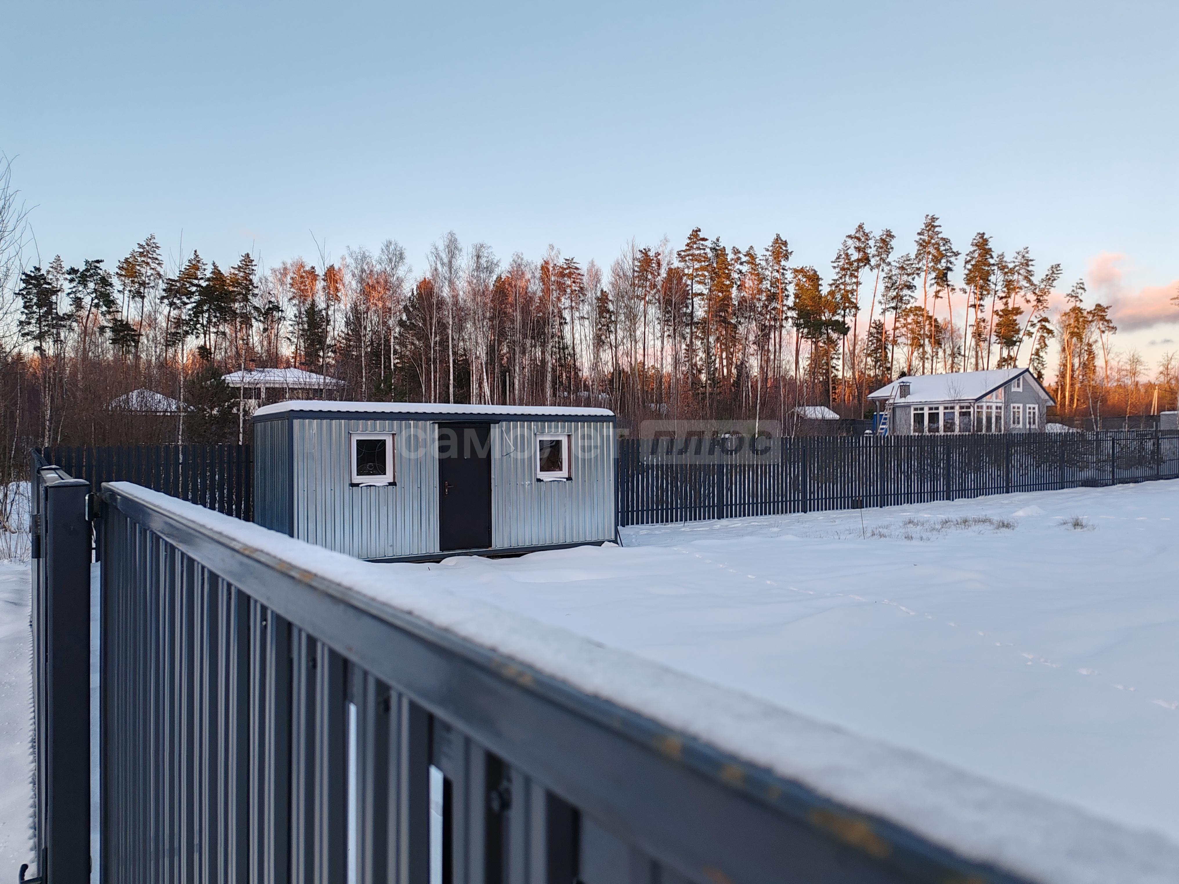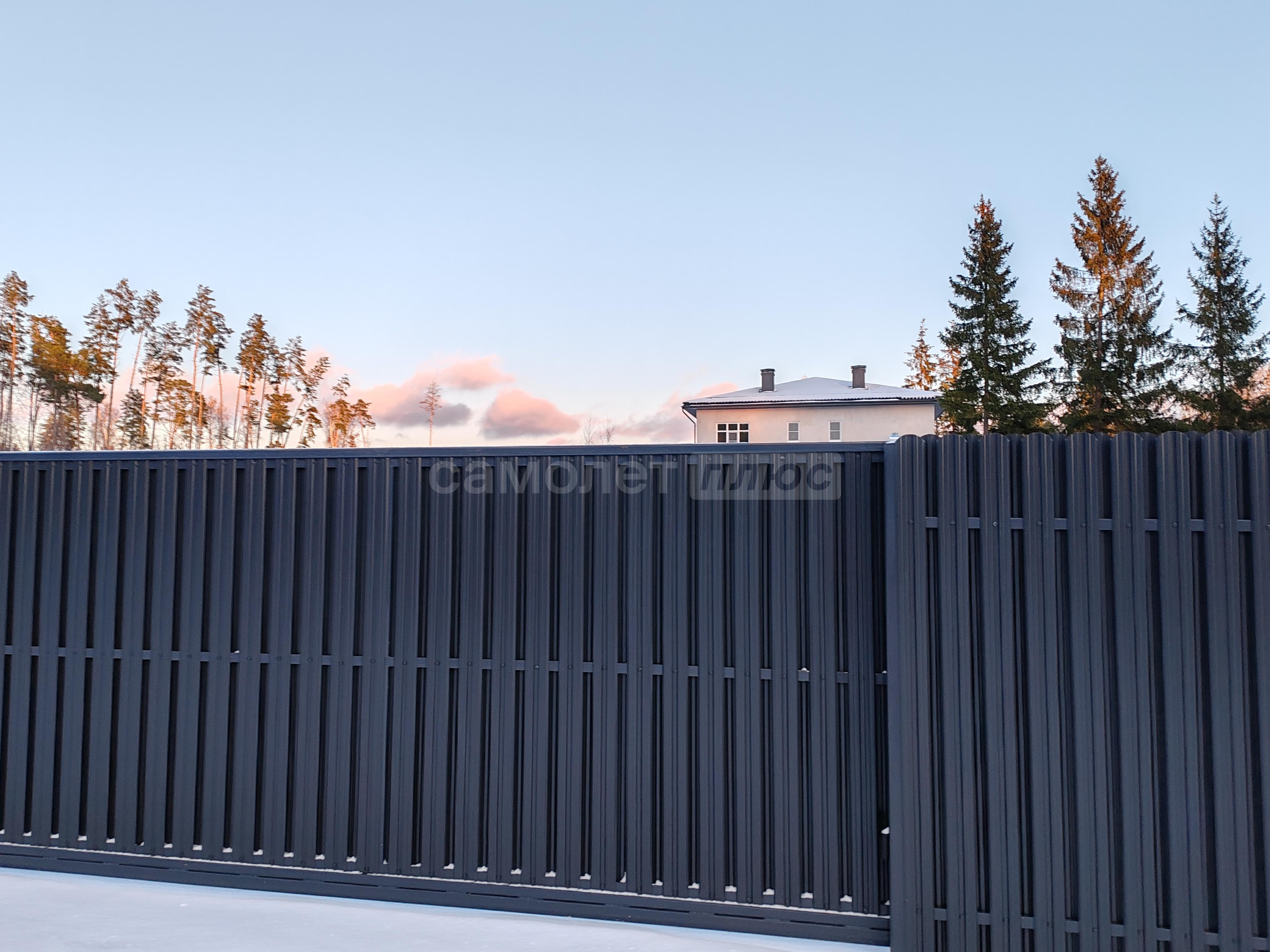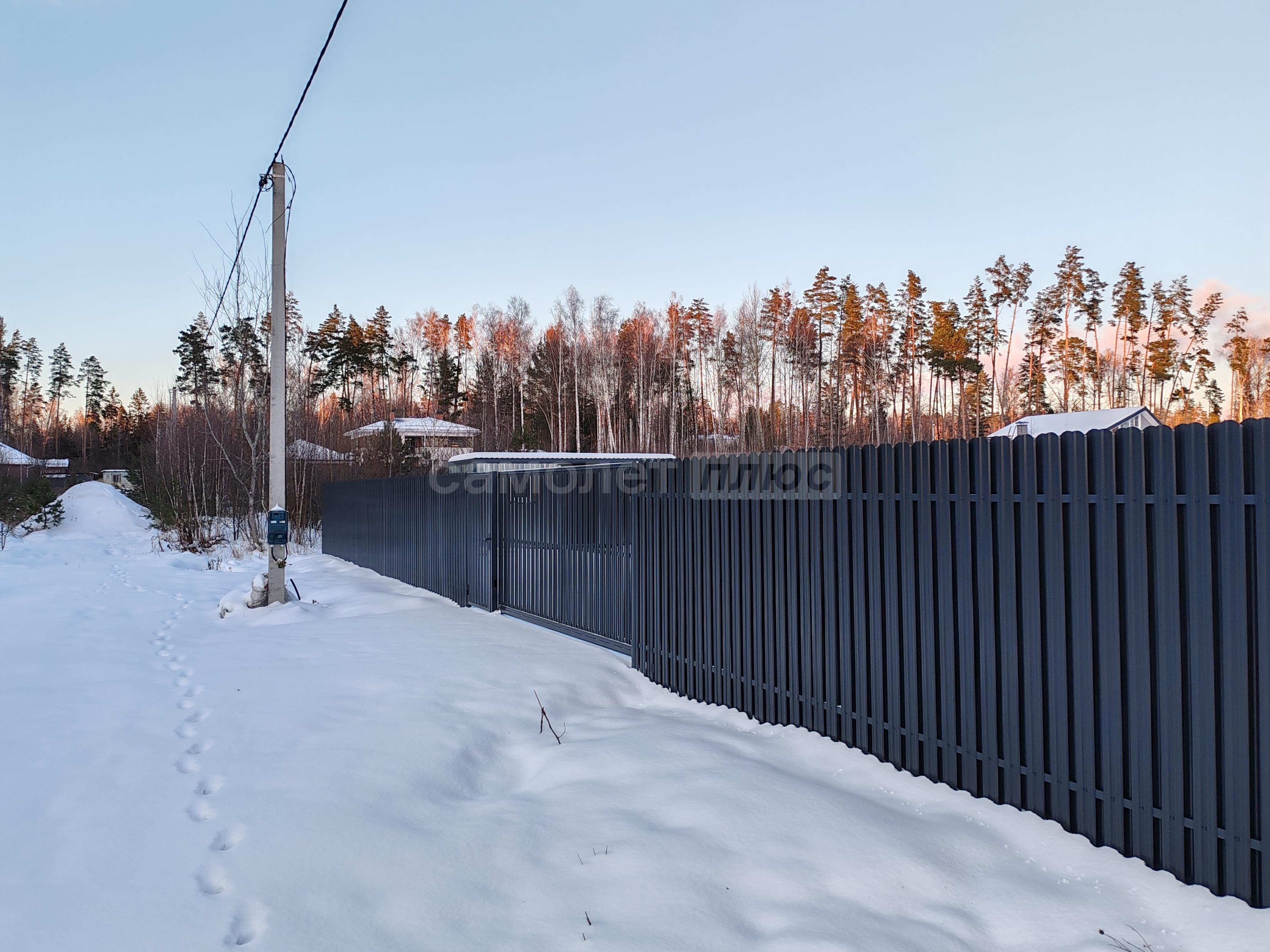 По периметру участка установлен каркас под забор, и откатные ворота.