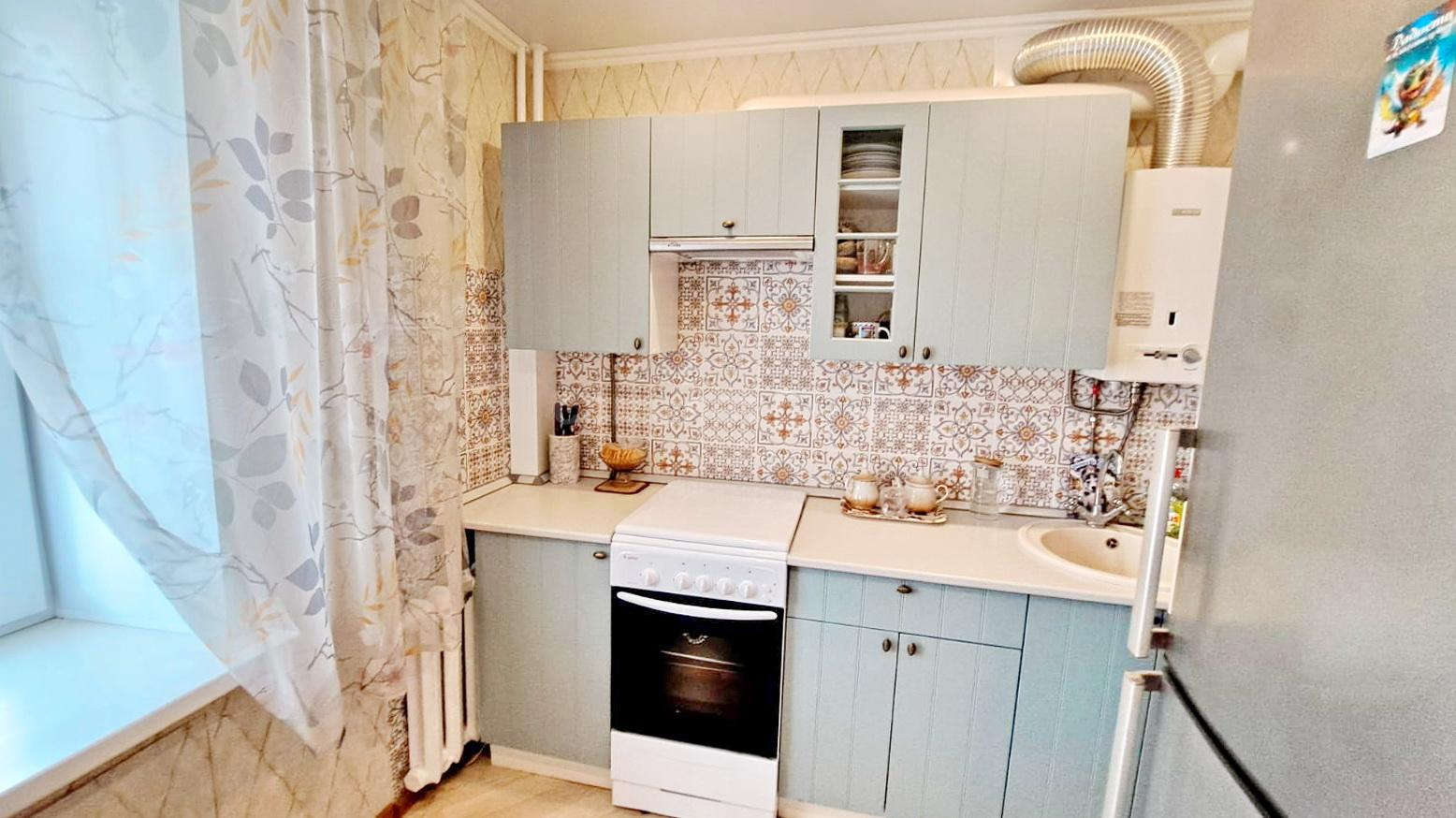 В квартире выполнен косметический ремонт. Оборудована кухонным гарнитуром, есть холодильник, стиральная машина, варочная панель, духовой шкаф, микроволновая печь.