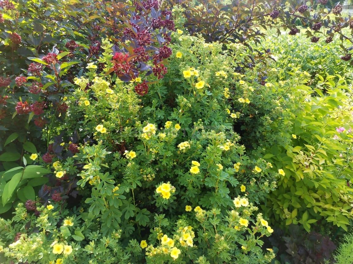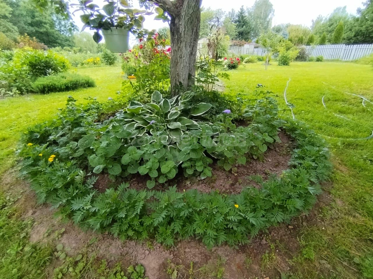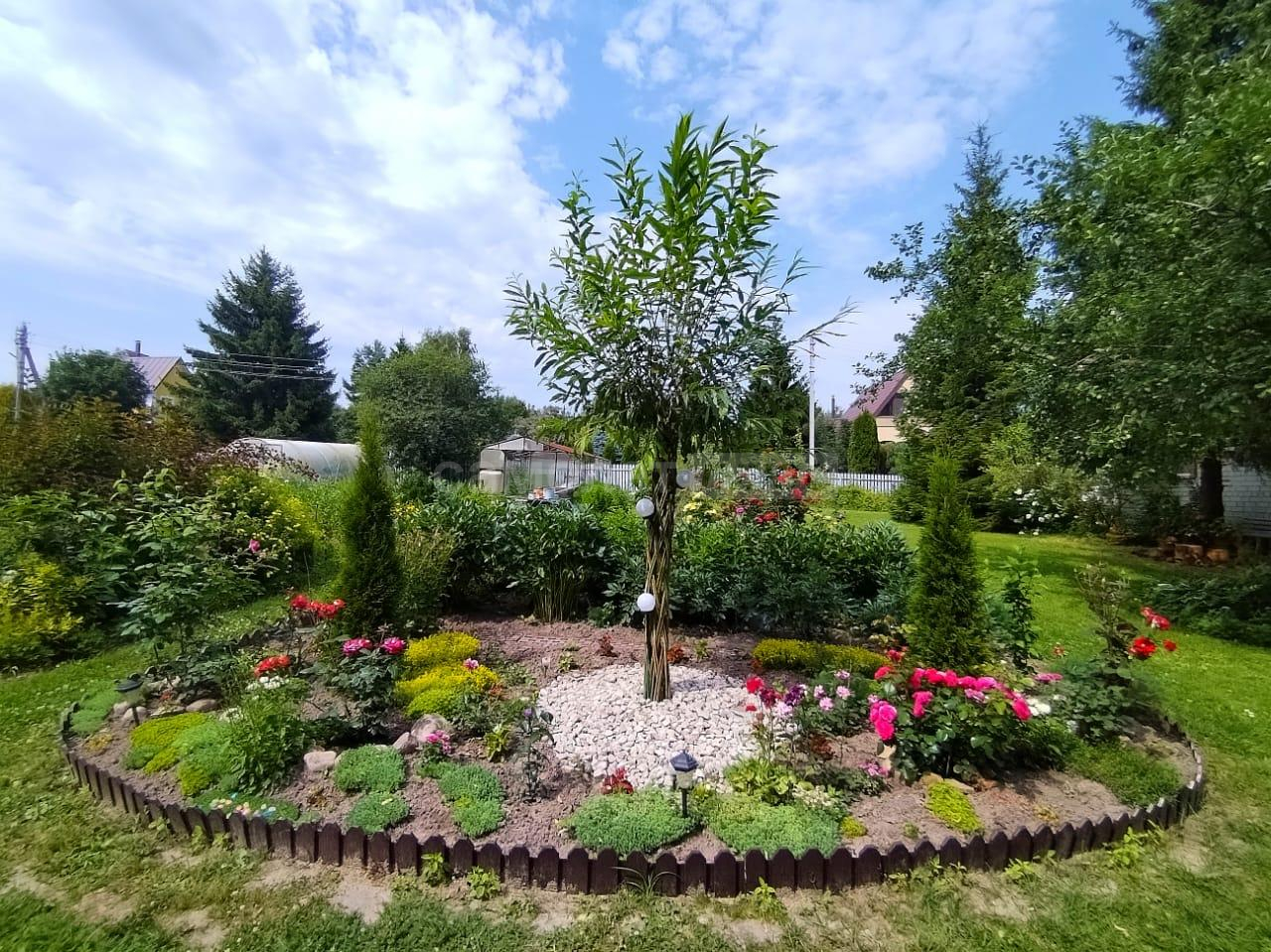 Благоустроенная территория с садовыми деревьями, кустарниками и цветниками, благоухающим розарием.
