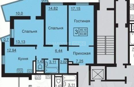 Общая площадь квартиры 83 кв.м. Плюс лоджия 10 кв.м. и балкон. Комнаты 13,15 17 кв.м. Кухня 13 кв.м. В квартире установлены окна ПВХ.