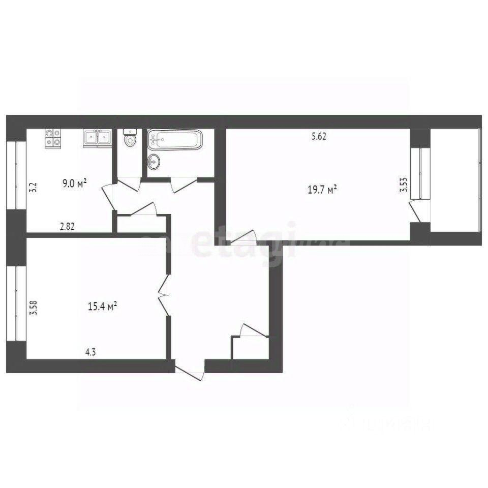 Общая площадь составляет 66.4 кв. м, жилая — 48.1 кв. м, площадь кухни — 6.4 кв. м. Высота потолков — 2.5 метра.