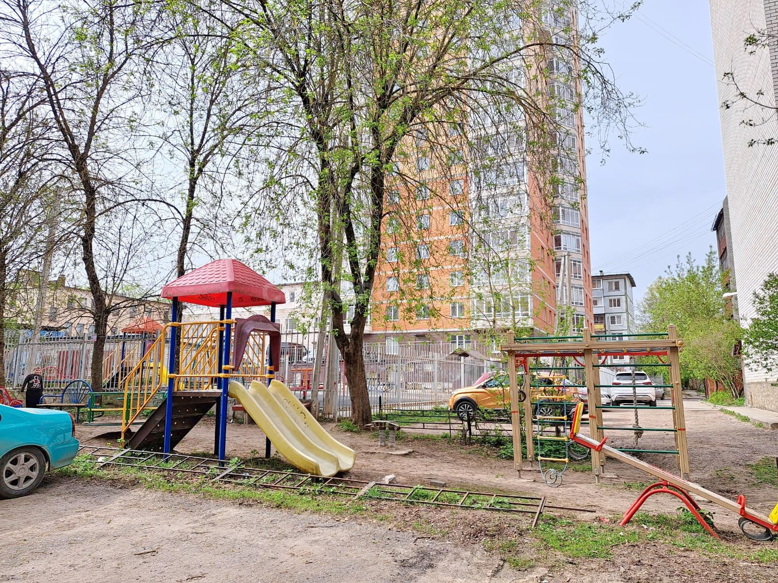 Во дворе детская игровая площадка, спортивная футбольная площадка, много зелёных посадок.