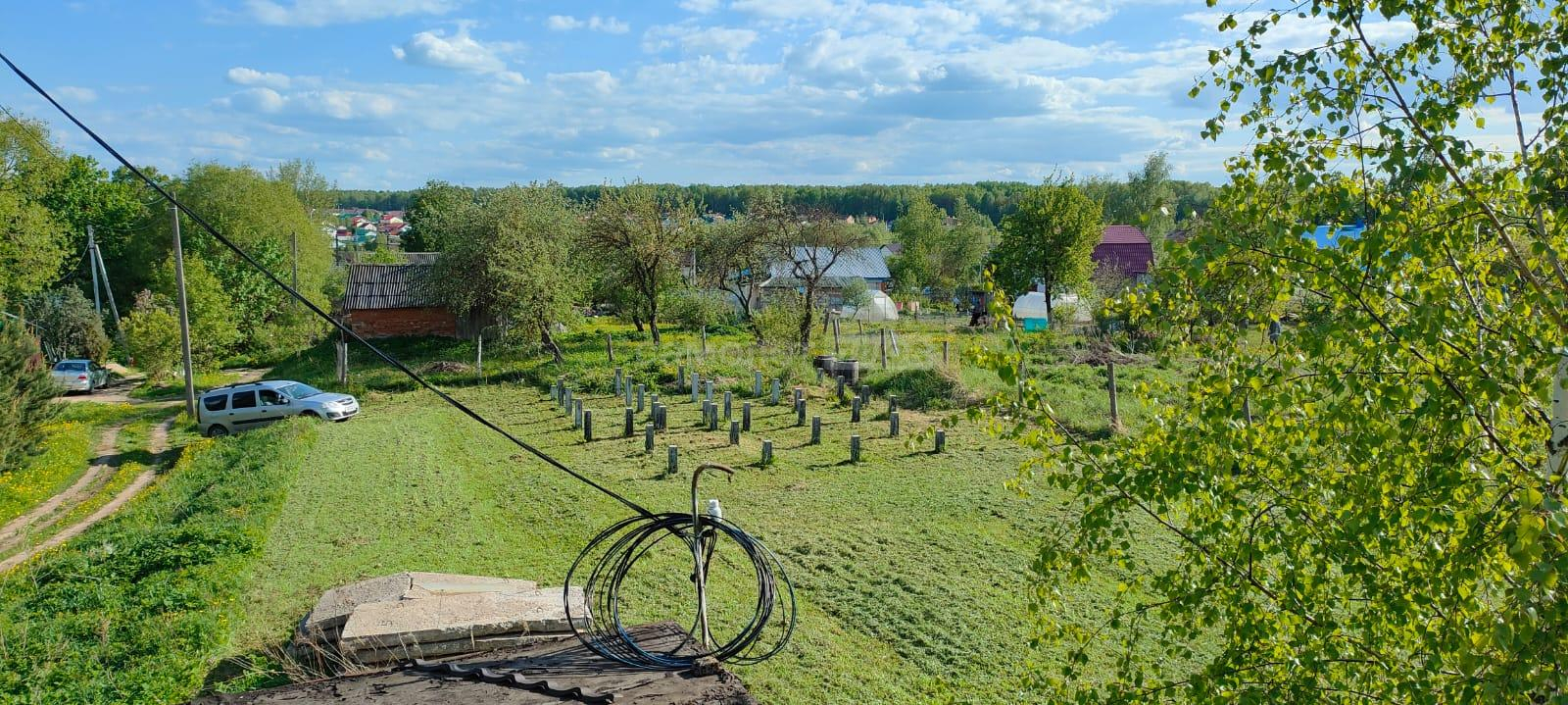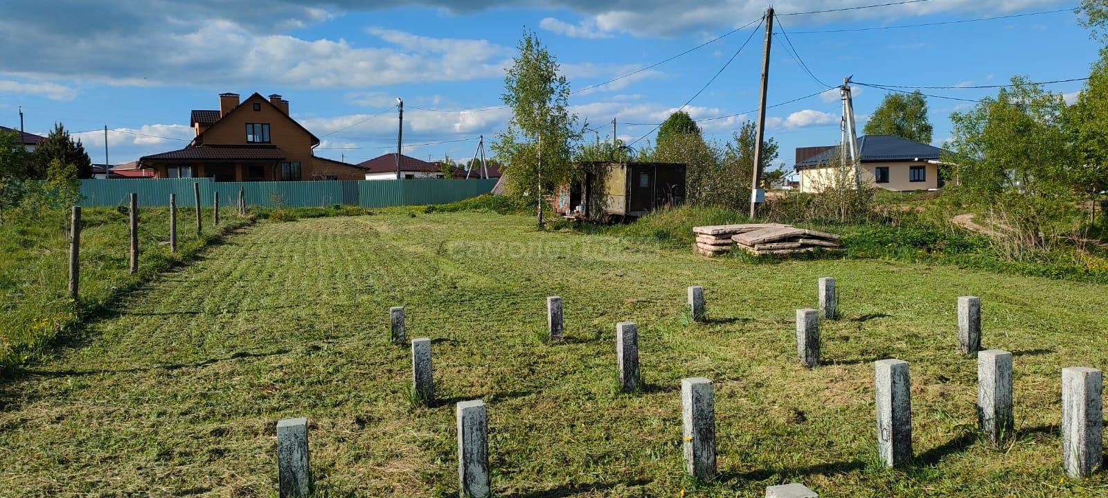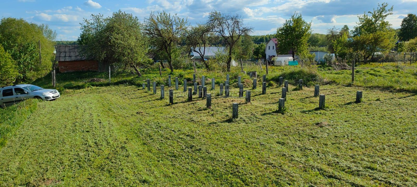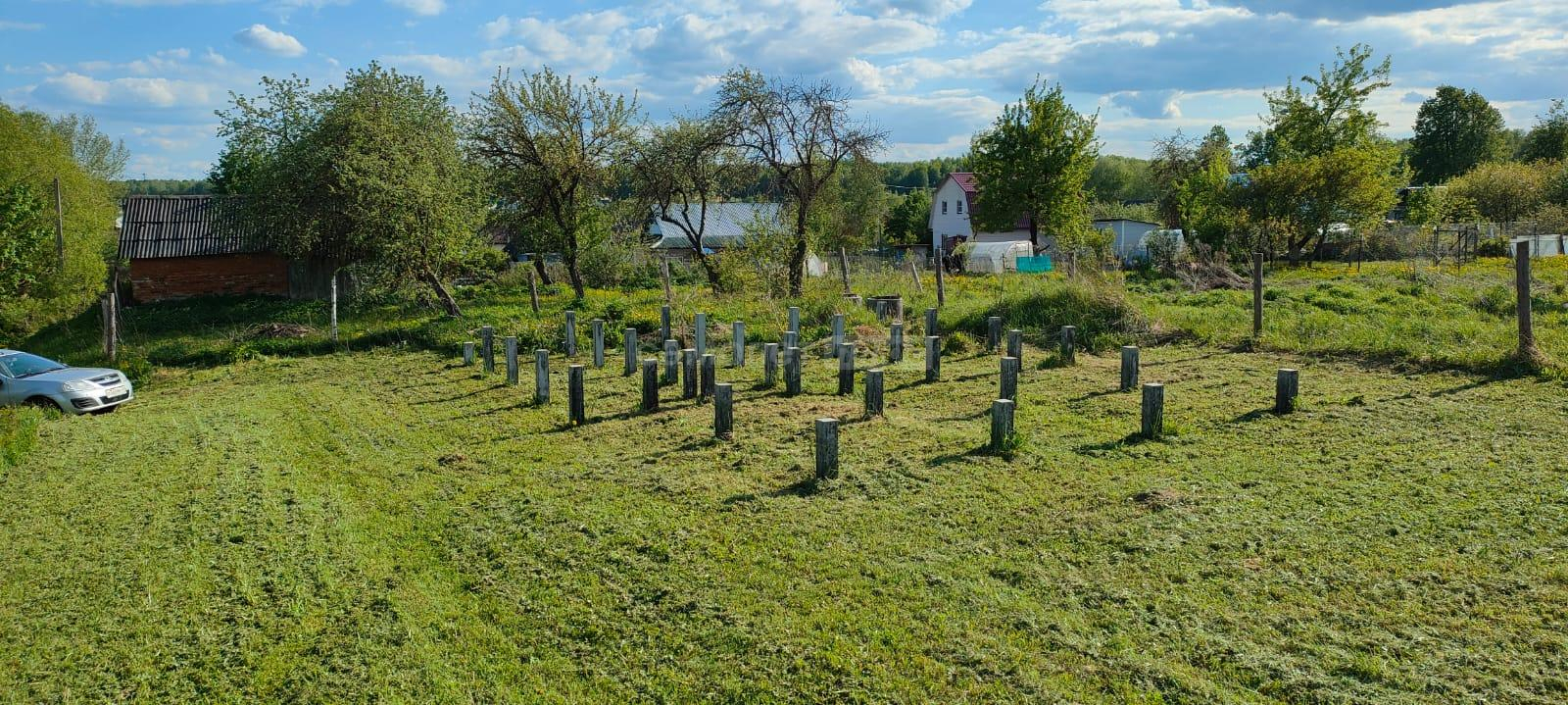 На участке есть постройка из бруса под баню, установлены столбы для навеса, высажены деревья.