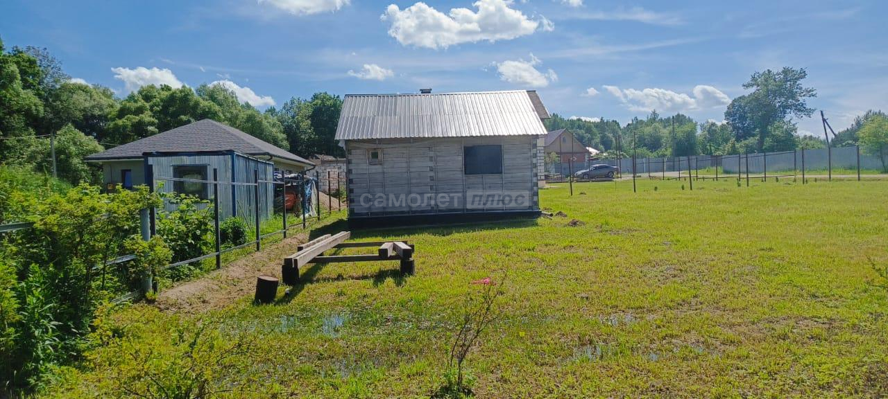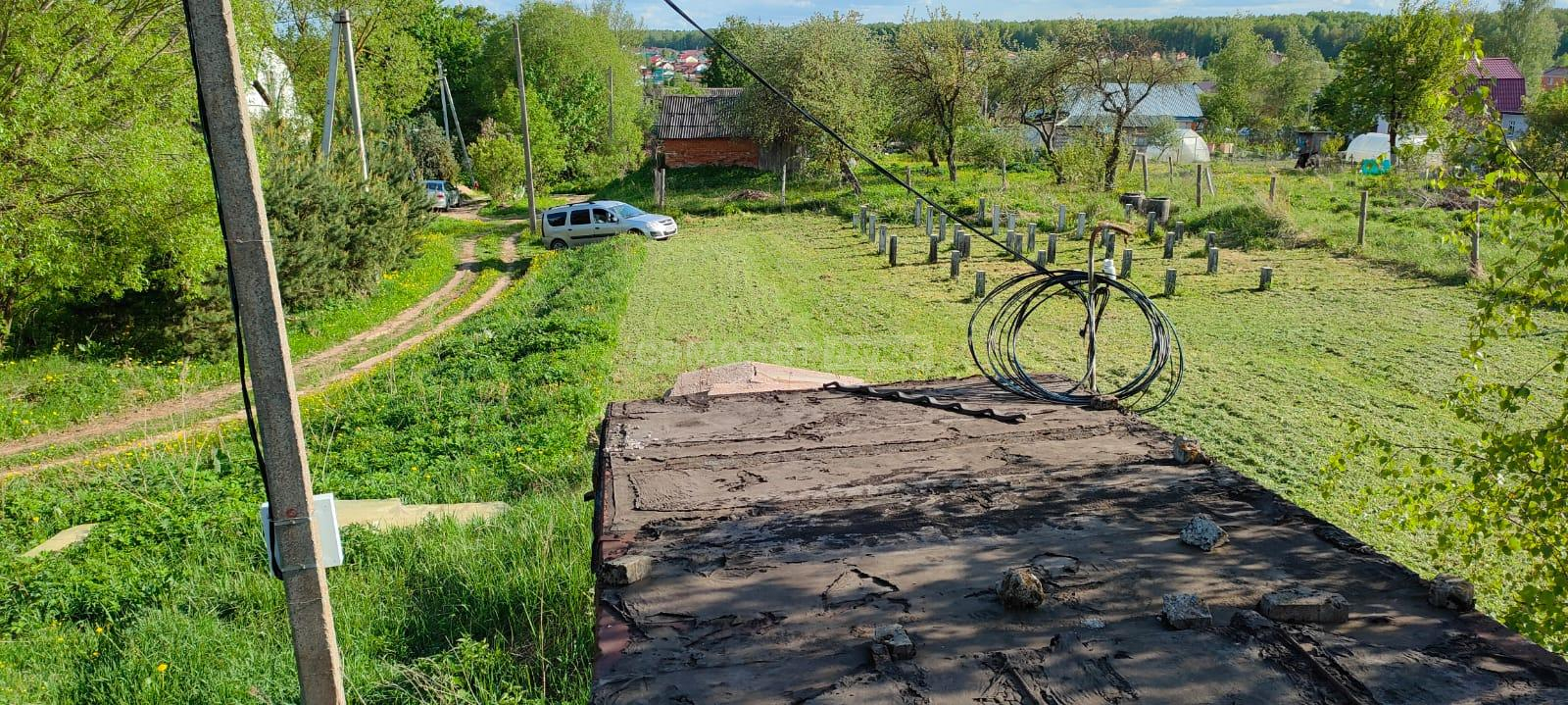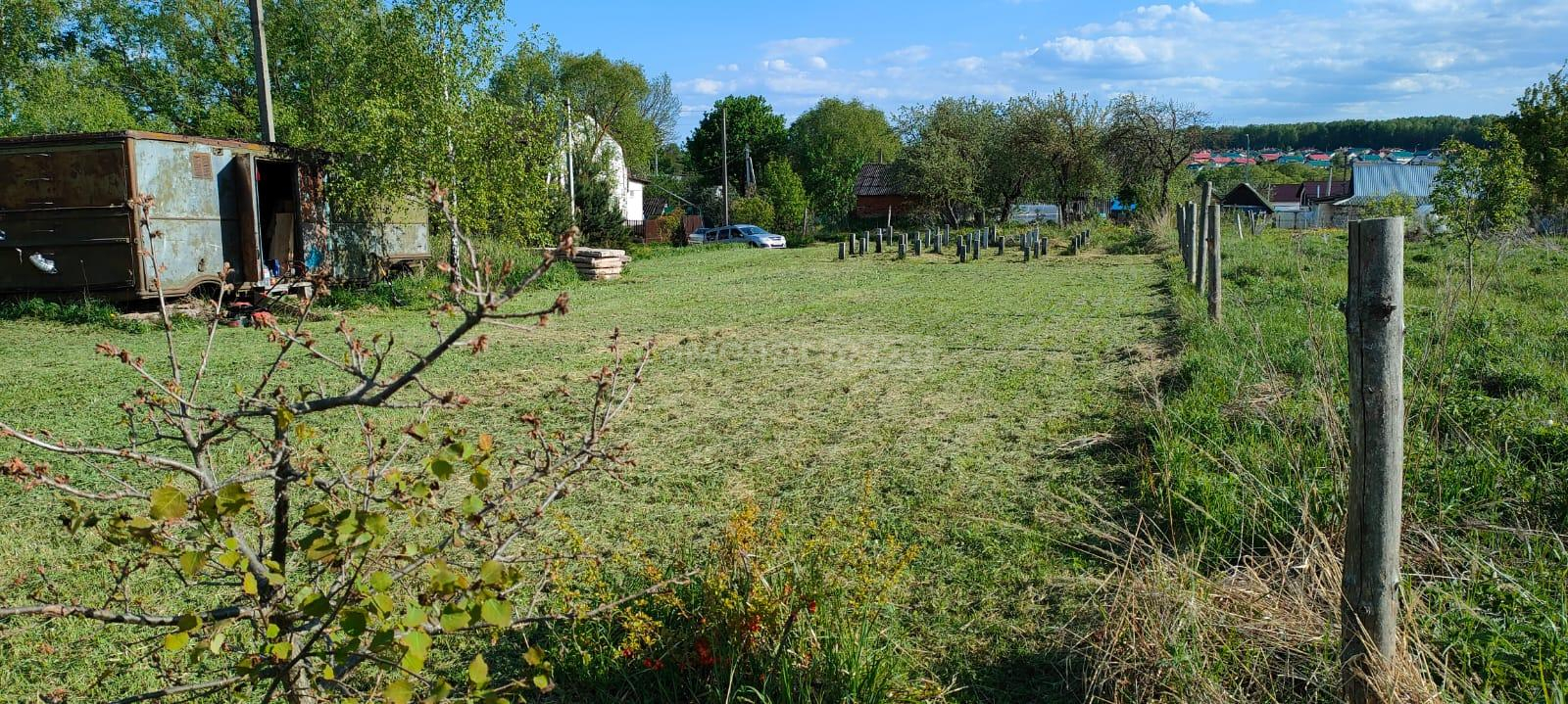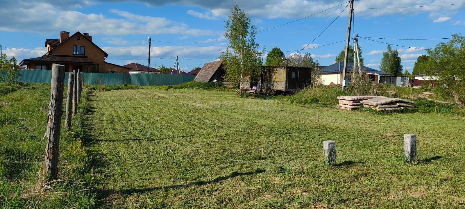 На участке есть постройка из бруса под баню, установлены столбы для навеса, высажены деревья.