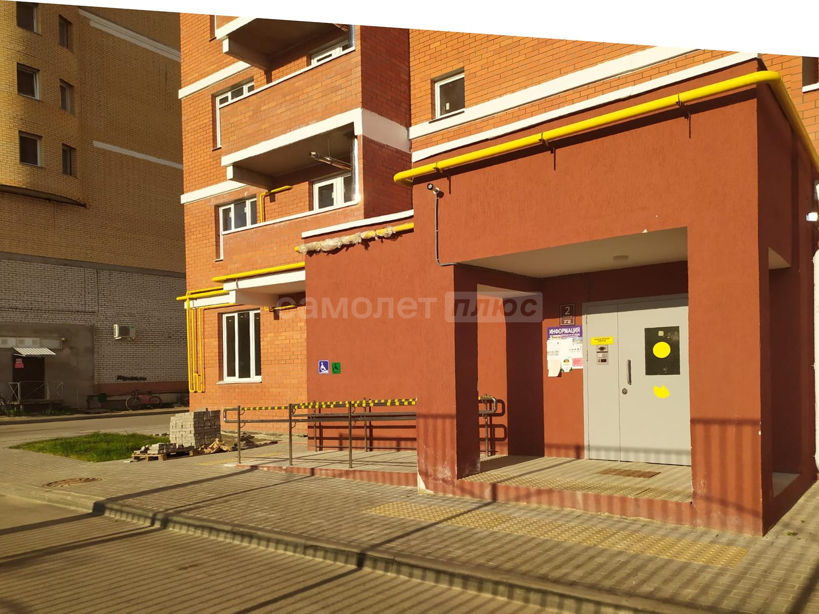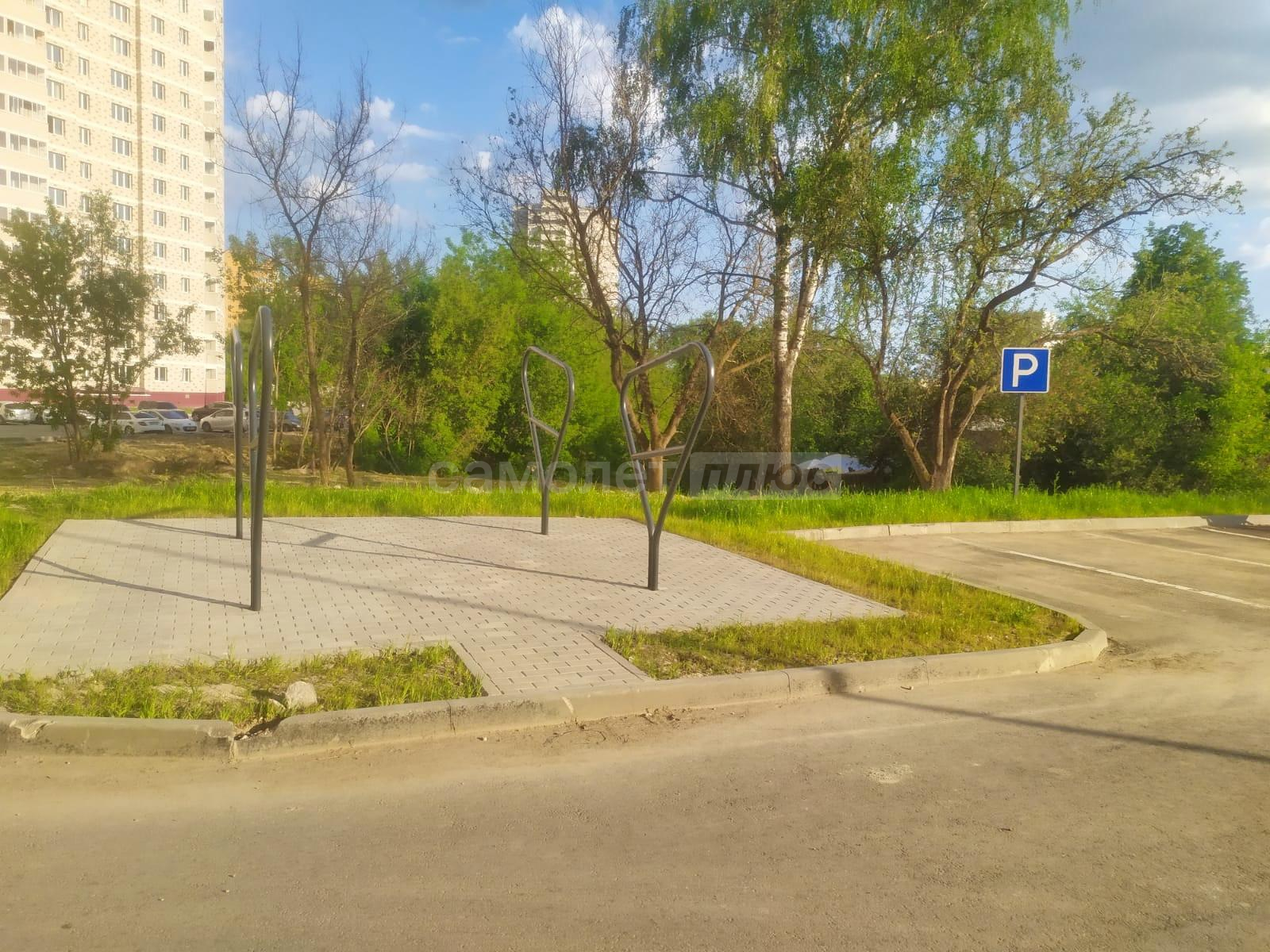 Во входной группе подъезда большое пространство для велосипедов и колясок. Во дворе собственная огроменная парковка, детская и спортивные площадки. К подъезду ведет пандус. Рядом частный сектор.