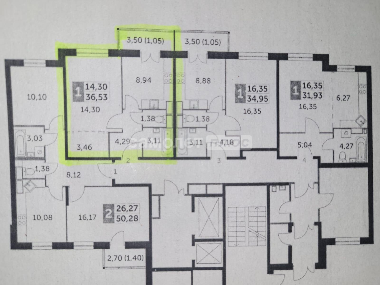 Общая площадь квартиры – 36,5 м2. Кухня 9 м2 с выходом на лоджию 3,5 м2, комната 14,3 м2, санузел раздельный.