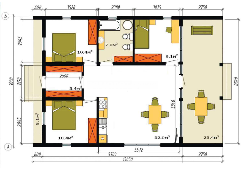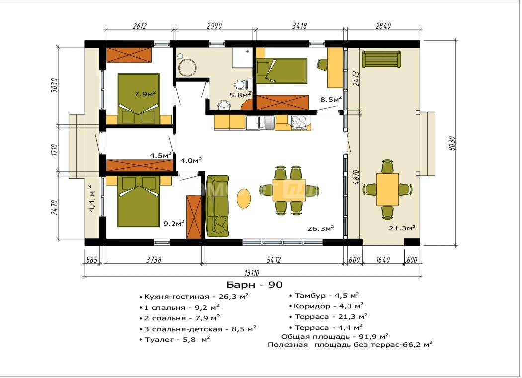 Самая популярная планировка: три спальни (10,4 + 10,4 + 9,1 кв.м.) и кухня-гостиная 32 кв.м., санузел 7 кв.м., холл 5,4 кв.м., терраса 23,4 кв.м.