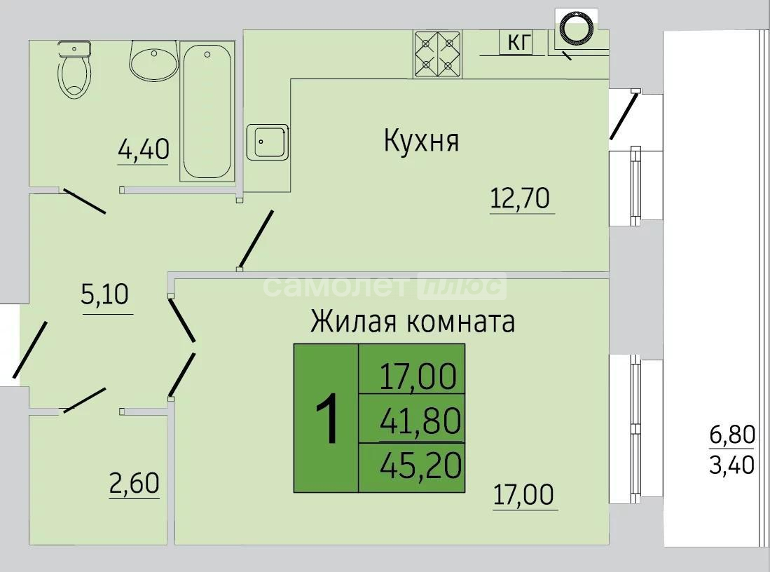 - Общая площадь 45,2м2, жилая 41,8, кухня 12,7кв.м (Лоджия 6,8кв.м)