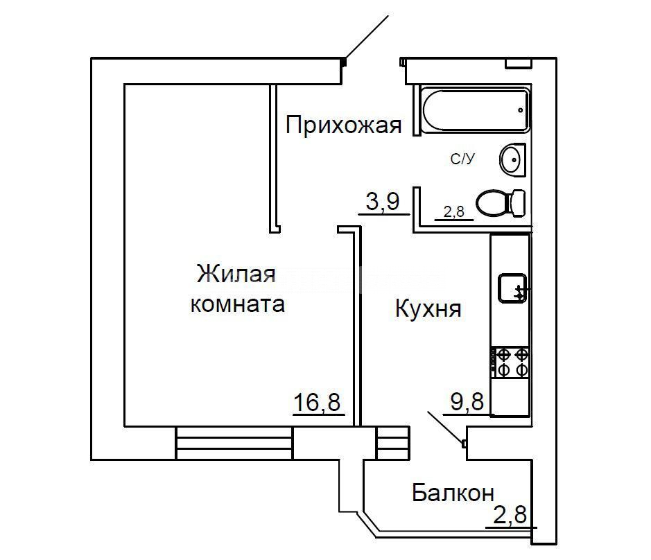 Общая площадь 34,8 кв.м. (Лоджия 3,4кв.м, по коэффициенту 0,5) Просторная кухня 9,8 кв.м., Жилая 16,8 кв.м