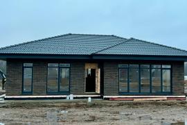 Крыша из минеральной (цементно-песчаная) черепица цвет графит, она выдвинута на один метр от стены дома, что позволяет прогуливаться вокруг дома в любую погоду по утепленной бетонной отмостки шириной 1.2 метра, которая обезапасит ваш дом и сохранит красивый внешний вид